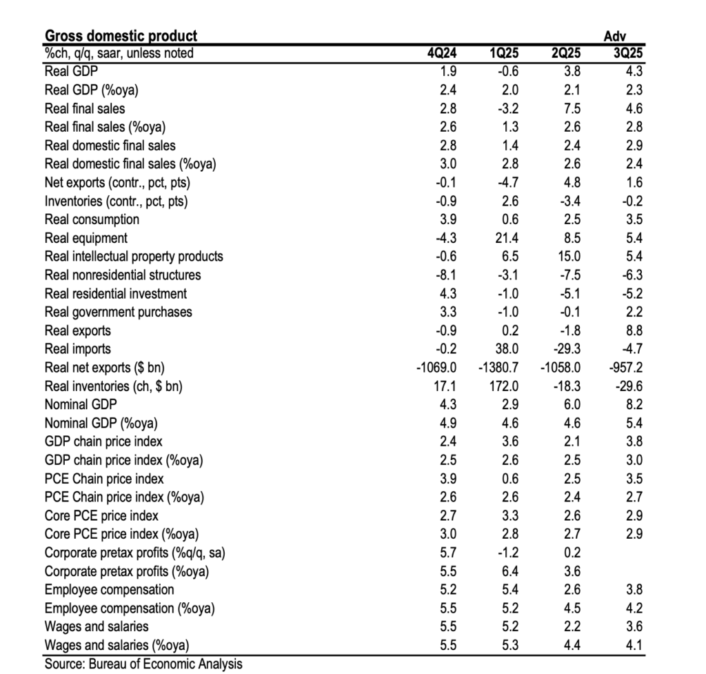 Real GDP surged at a 4.3% annualized rate in the third quarter, delivering the strongest quarterly expansion in two years and handily beating both the consensus and our own upgraded 3.5% forecast. This print confirms significant mid-year momentum, effectively brushing off concerns regarding a softening labor market. While growth has averaged 2.5% across 2025, we now see meaningful upside risk to our 1.0% projection for the fourth quarter. The primary engine was a 3.5% acceleration in consumer spending, with robust demand spanning both goods and services. Business investment remained durable at 2.8%, despite a sharper-than-expected 6.3% contraction in non-residential structures. However, equipment spending surprised to the upside at 5.4%, bolstered by tech imports that suggest continued strength through year-end. Government spending and net exports also provided tailwinds, though a 3.8% jump in the GDP price index—despite core PCE printing in line at 2.9%—highlights persistent inflationary heat.