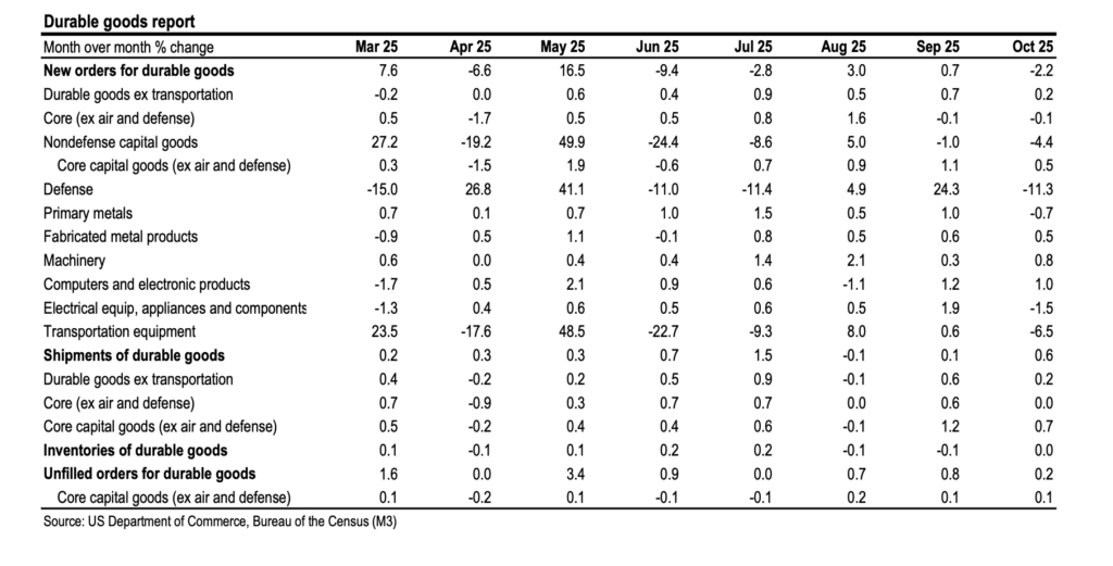 Due to the government shutdown, this report serves as a consolidated look at both GDP and GDI, the latter of which rose a more modest 2.4%. Corporate health remains a bright spot; pre-tax profits jumped 4.2% in Q3—a 9.1% year-over-year increase—proving that firms are successfully navigating rising tariff costs. Looking ahead, we anticipate a consumption slowdown as policy headwinds mount and higher tariffs firm up inflation. That said, technical measurement issues may temporarily inflate Q4 real household spending data. While October’s durable goods orders fell 2.2% headline, this was largely a defense-driven drag. The core capital goods segment—nondefense ex-aircraft—remains on a steady uptrend, with orders and shipments rising 0.5% and 0.7%, respectively. We are fading the weakness in manufacturing surveys, expecting tech imports and a recovery in the motor vehicle and aircraft sectors to bridge the gap into 2026.