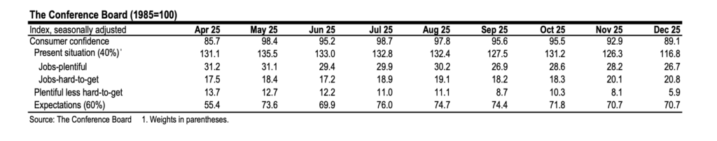 Industrial production data arrived with a softer tilt, showing a combined stagnation across October and November. Manufacturing IP contracted 0.4% in October before a tepid 0.1% recovery in November, largely due to volatility in motor vehicles. However, aircraft manufacturing remains a powerhouse, growing 3.2% cumulatively as it moves past last year’s strike disruptions, while computer equipment IP surged 2.5% in November. The most significant red flag comes from the Conference Board’s December Consumer Confidence report, which tumbled to 89.1. The “present situation” index hit a five-year low, and the labor market differential collapsed to 5.9%—levels not seen since early 2021. This deterioration in sentiment strongly suggests a further rise in the unemployment rate, prompting us to lift our peak unemployment forecast to 4.7% for the first quarter of 2026.